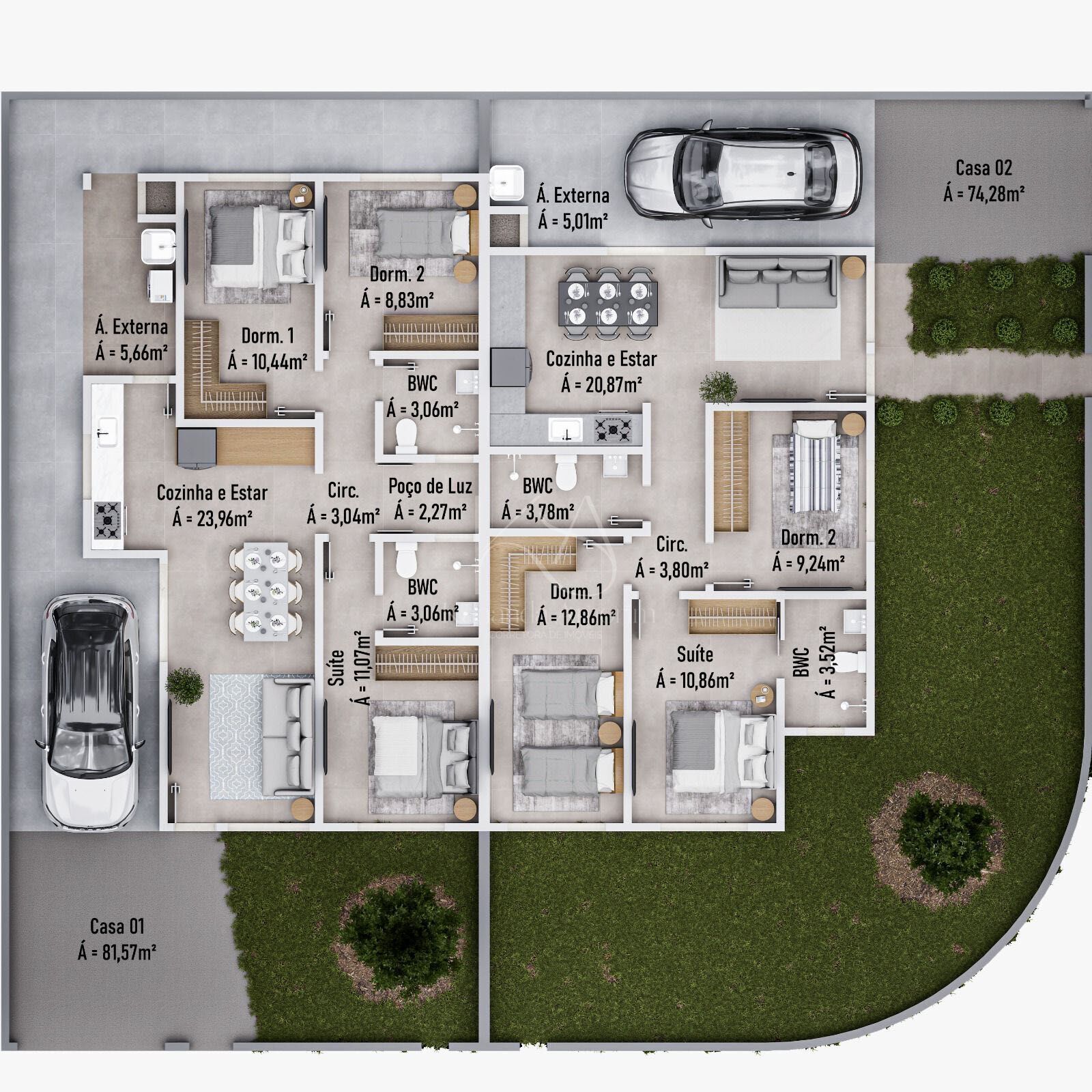 📐 Casa 02: aproximadamente 74,28 m² de área construída